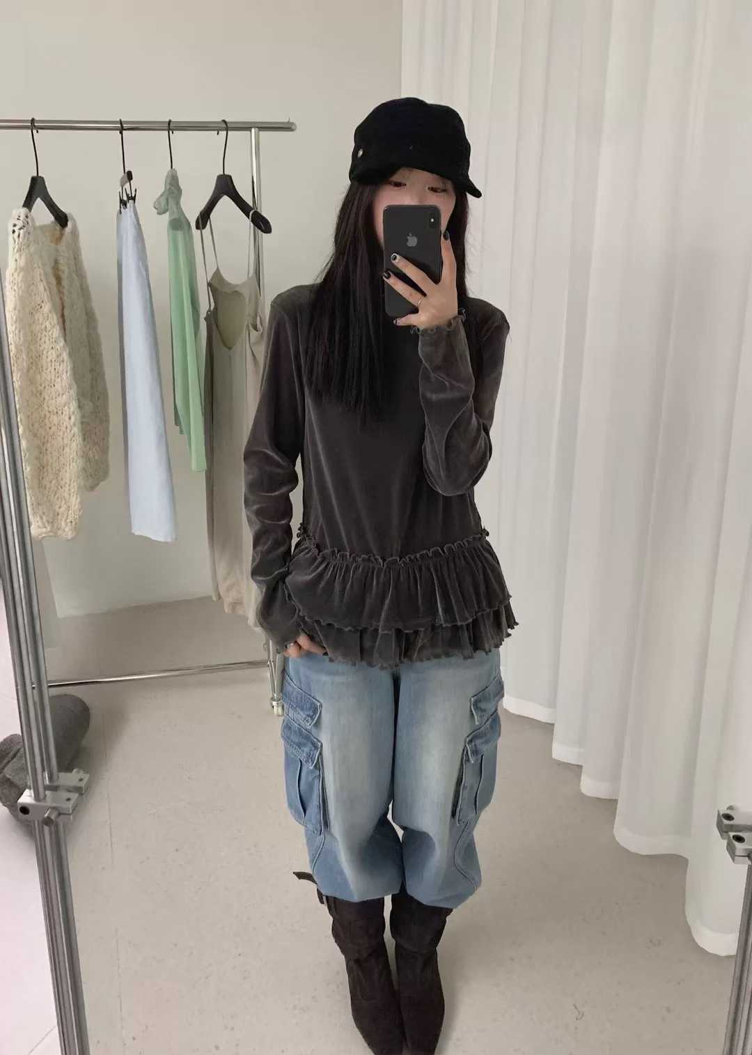 157133# 双层木耳花边丝绒上衣 |